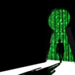 Elite hacker entering a room through a keyhole silhouette 3d illustration information security backdoor concept with green digital background matrix