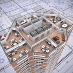 3D cut of office building on architect's drawing.