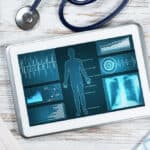 Medical diagnostics in modern pulmonology. Tablet computer with medical application interface on screen. Top view stethoscope and cardiogram on wooden desk. Digital tuberculosis screening test