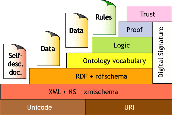 The Semantic Web has its technology stack. RDF stands for Resource Description Framework. It is defined by the World Wide Web Consortium (W3C). It has an XML syntax that is much richer than mainly syntactic HTM. It adds semantics meta-data. To see one benefit of RDF enrichment of the Web, W3.org describes it as “Adding machine-readable information to Web pages using, for example, the popular schema.org vocabulary, enabling them to be displayed in an enhanced format on search engines or to be processed automatically by third-party applications.” The stack illustrates other technologies. One of the most notable of these is OWL – the Web Ontology Language for even richer (extending RDF) semantics and potential reasoning. If adopted in large numbers, the benefit of a Semantic Web is the richer and more precise experiences in especially navigating and searching the Web. There are other benefits.