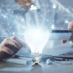 Double exposure of man hands holding a credit card and bulb drawing. Idea E-commerce concept.