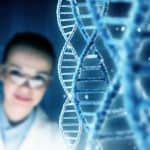 Woman scientist examining DNA molecule image at media screen