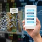 Female hand holding mobile phone showing the chatbot message While being decided place the order over the Stock market chart,Closeup Stock market exchange data on LED display, AI technology concept