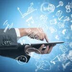 Businessman working with tablet and social media with modern sketch symbol