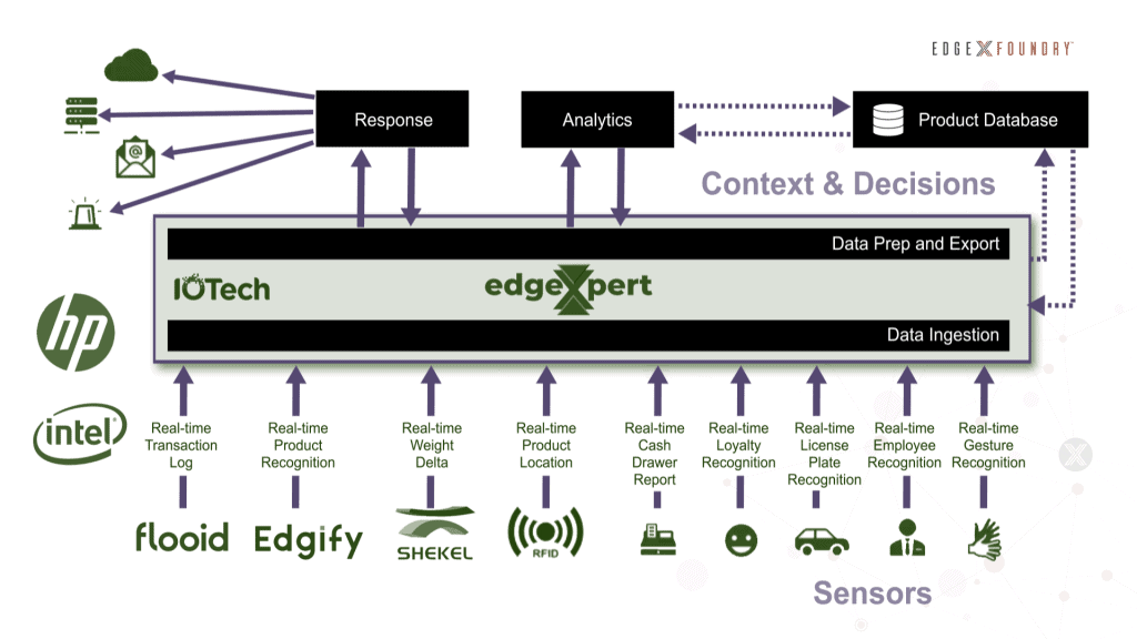 These capabilities were illustrated successfully as part of the Open Retail Initiative Loss Prevention demonstration at NRF 2020, which coincided with the one-year anniversary of the ORI’s founding. Working together on a demo were six initiative members: Edgify, Flooid, Shekel, and LF Edge members HP, IOTech, and Intel. The demo, which was for the Intel booth, showcased the value of real-time sensor fusion for a loss prevention use case at self-checkout. Real-time data was aggregated through the EdgeX middleware from different common retail systems, including POS real-time transaction log, CV-based object detection, scale solution, and RFID. All of this was in a single pane of glass to illustrate how traditional integration roadblocks can be a thing of the past.