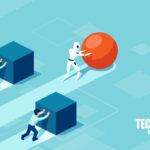Vector of a robot pushing a sphere leading the race against a group of slower businesspeople pushing boxes. Technology optimization in business concept
