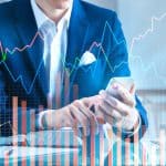 Close up of businessman hands using smartphone with abstract glowing forex chart at workplace. Finance and marketing concept. Double exposure
