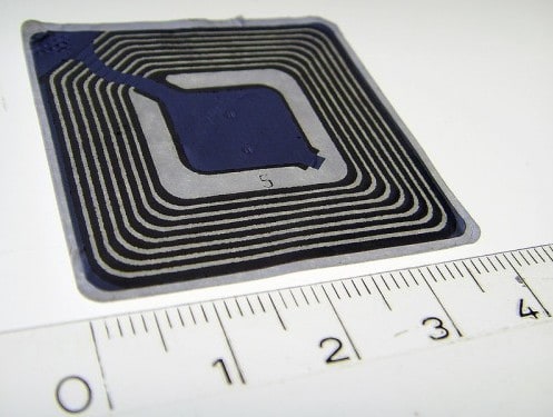 An RFID chip measured against a ruler; one of these can be thrown into a baggage tag (Source: WikiMedia Commons)