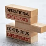 Operational excellence and continuous improvement text on wooden blocks. Business concept.