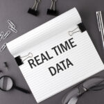 Text REAL TIME DATA on Notebook and office tools on gray desktop