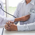 Doctor received corruption money, hand putting money in patient pocket form of dollar banknotes, Bribery and corruption in Health Care Industry.