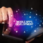 Businessman holding a foldable smartphone with MOBILE APPS DEVELOPMENT inscription, new technology concept