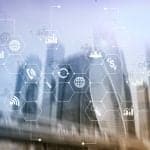 Double exposure mixed media. Diagrams and icons on hologram screen. Business people and modern city on background.