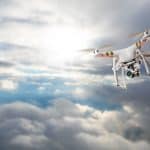 Drone for industrial works flying above clouds. Concept of pottential danger of aircraft collision