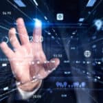 Businessman hand in formal suit touching digital glass screen with information statistics. Concept of high tech approach, recruitment process and logistics