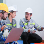 Professional engineer workers training and testing machine at industry factory. Concept people operation in industrial. Industry robot programming software for automated manufacturing technology.