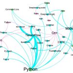 The edges are colored based on their source node. All pink edges have the same default width. Blue edge widths correspond to GitHub stars (a measure of popularity) for the deep learning tool form which the blue edge originates. The size of every node and the font size of its label correspond to node degree (the number of connections to that node).