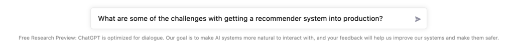 ChatGPT: There are several challenges that can arise when trying to get a recommender system into production. Some of these challenges include: