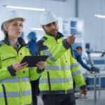 Chief Engineer and Project Supervisor in Safety Vests and Hard Hats Walk Through Modern Factory, Talking, Optimizing Production. Industrial Facility: Professionals Use Machinery.