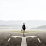 Back view of businesswoman standing on crossroads and making choice